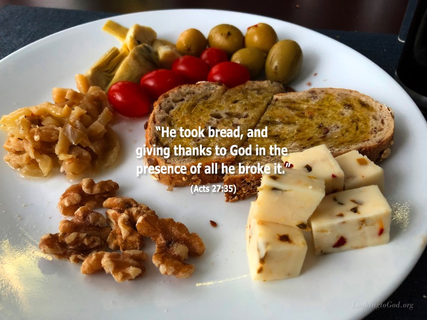 “‘Therefore I urge you to take some food. For it will give you strength, for not a hair is to perish from the head of any of you.’ And when he had said these things, he took bread, and giving thanks to God in the presence of all he broke it and began to eat.”