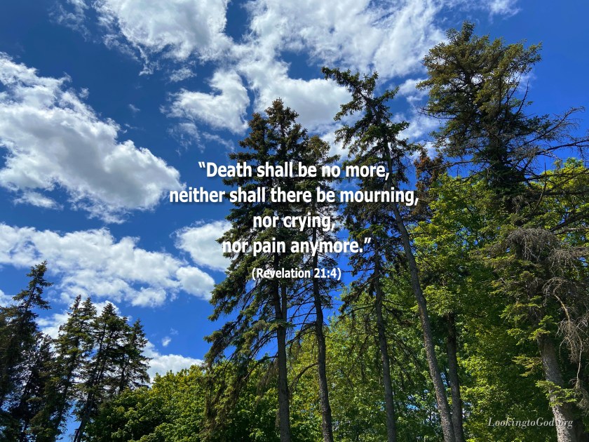 “He will wipe away every tear from their eyes, and death shall be no more, neither shall there be mourning, nor crying, nor pain anymore, for the former things have passed away.”